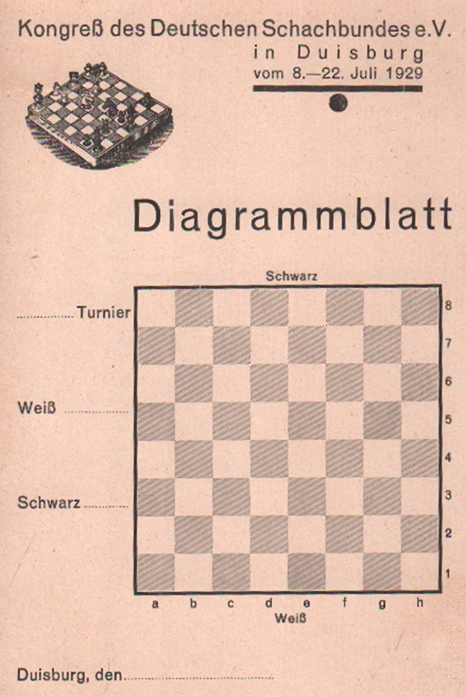 / Blankovordruck mit einem Diagrammblatt zum “Kongreß des Deutschen Schachbundes in Duisburg … 1929“. Größe