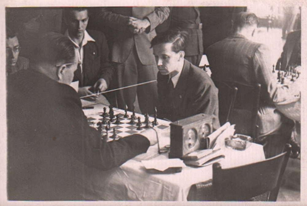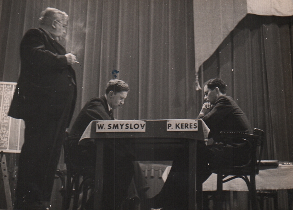 Smyslow und Keres bei einer Wettkampfpartie, die beide auf das Spielbrett