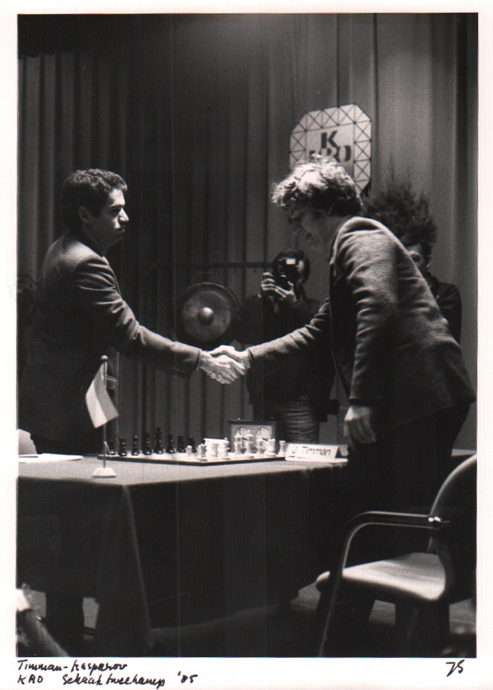 Foto zeigt Garri Kasparow und Jan Timman, die sich vor der Partie stehend über