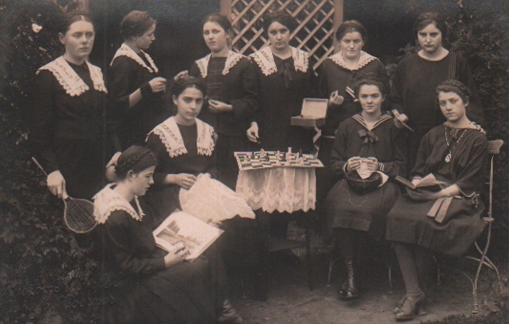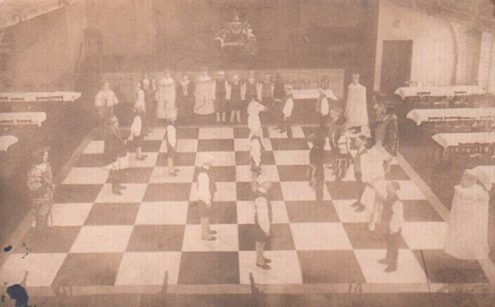 zwei Reihen um einen Schachtisch herum zu einem Gruppenbild versammelt haben: A.