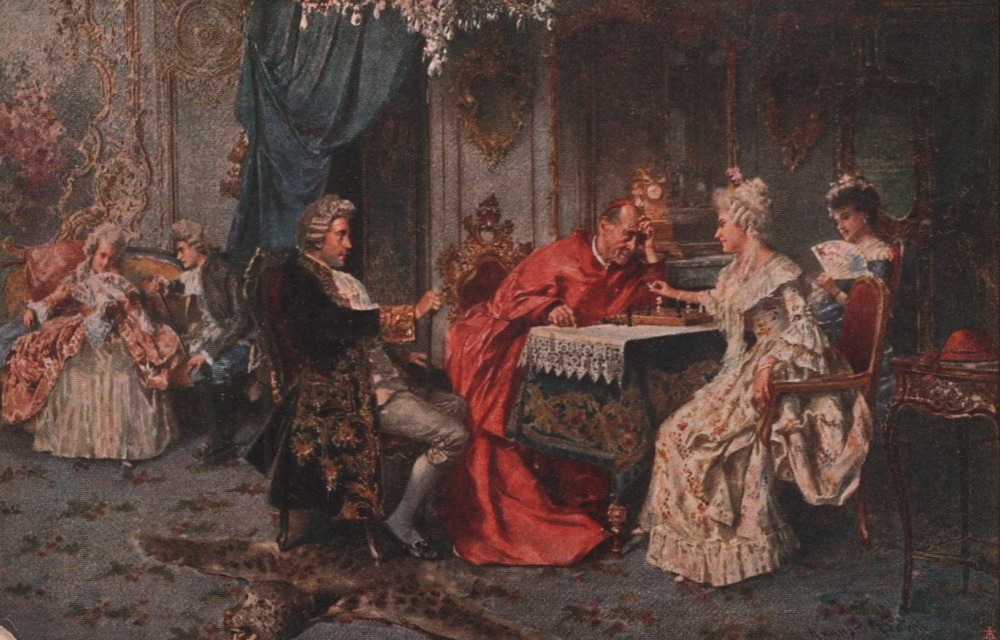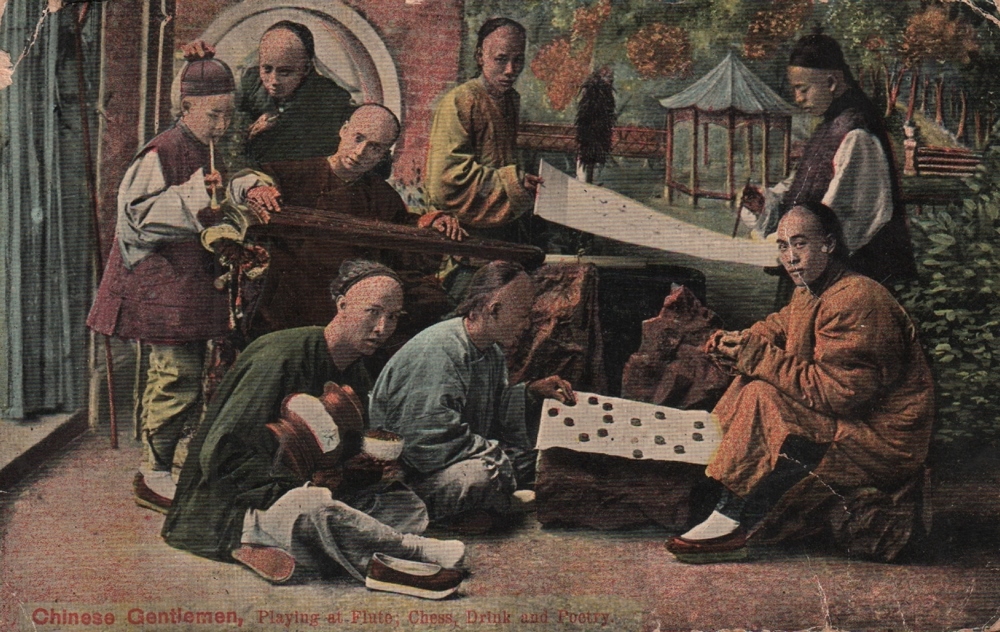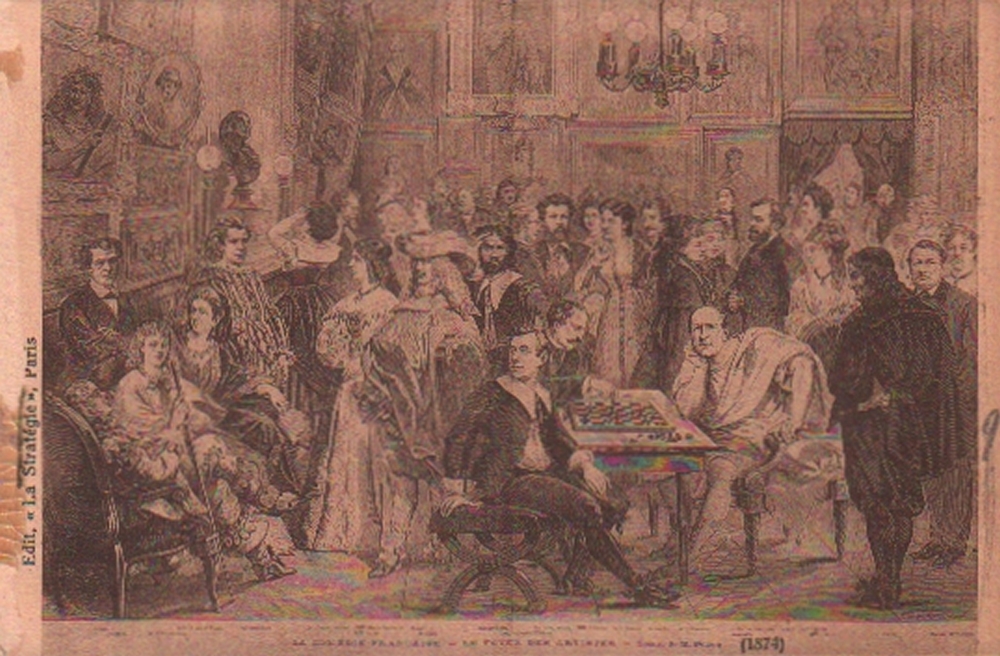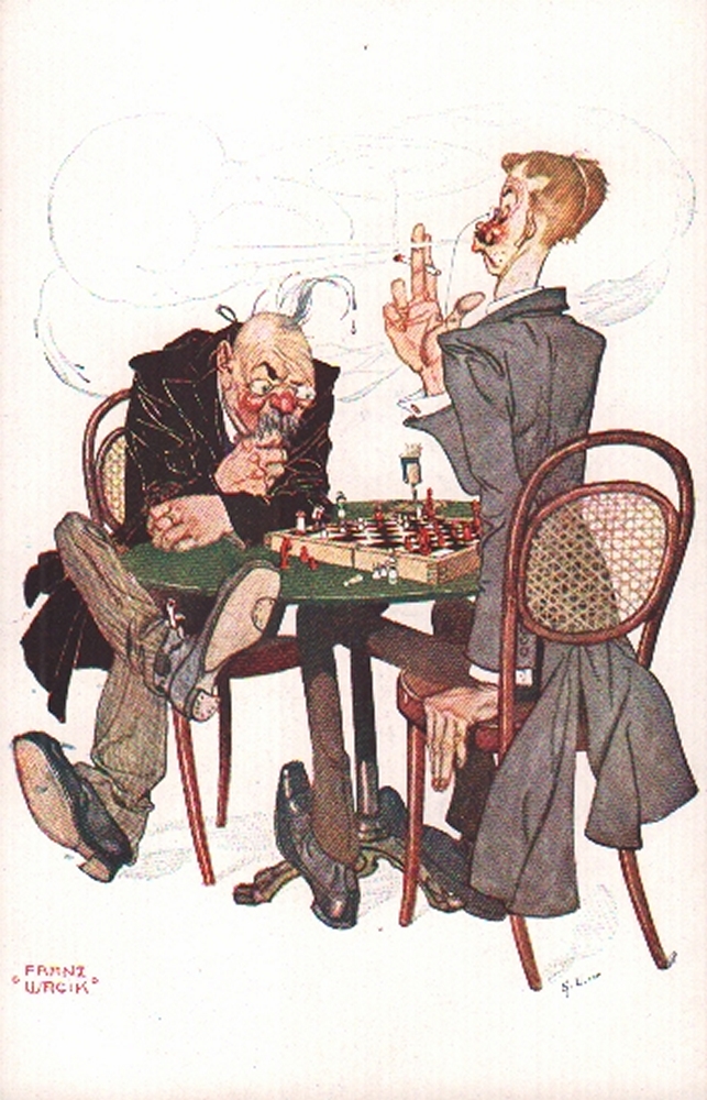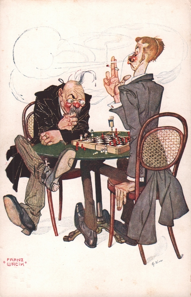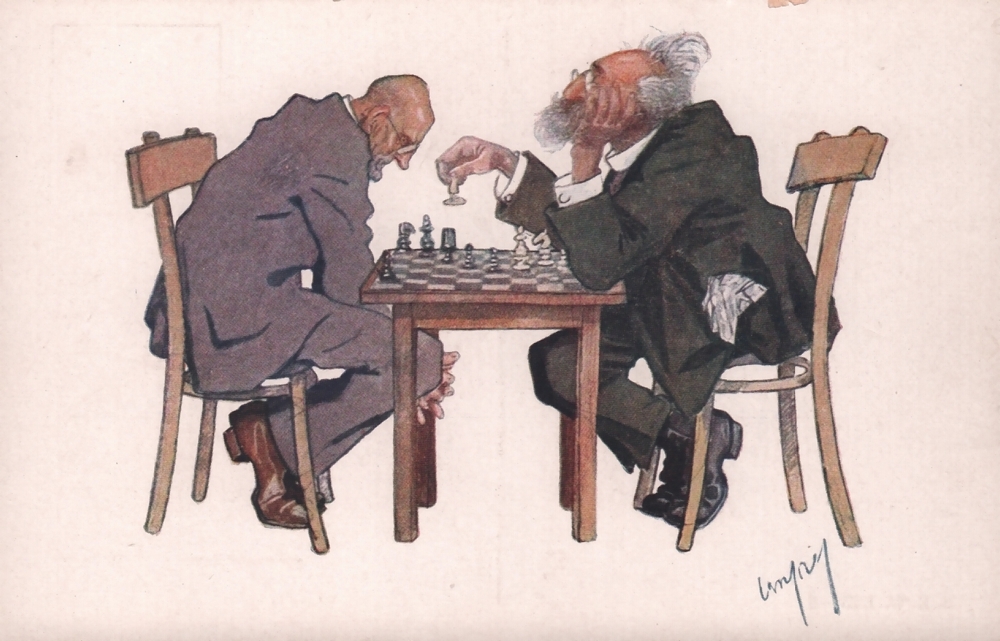Beobachtet werden die Partien von mehreren daneben sitzenden Herren, u. a. vom