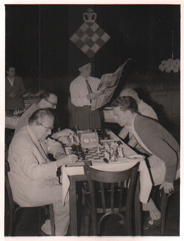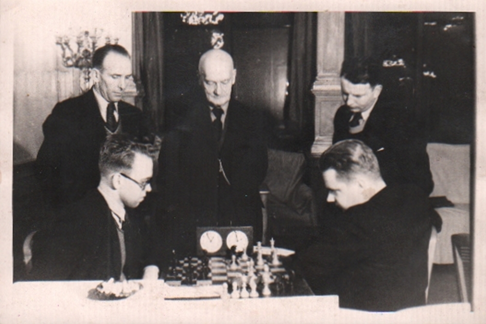 und Max Euwe sowie Wassili Smyslow und Paul Keres bei ihren jeweiligen Partien.