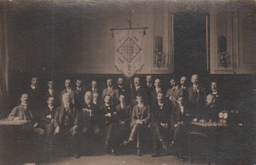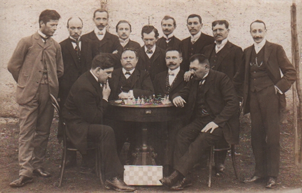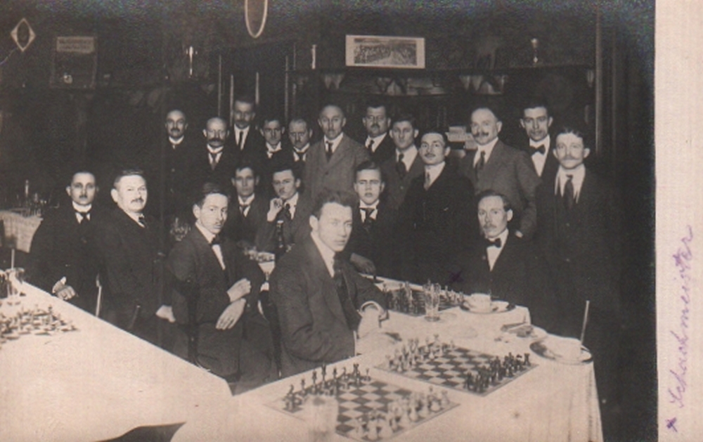 einem Tisch versammelt. Emanuel Lasker und Siegbert Tarrasch sitzen am Tisch bei