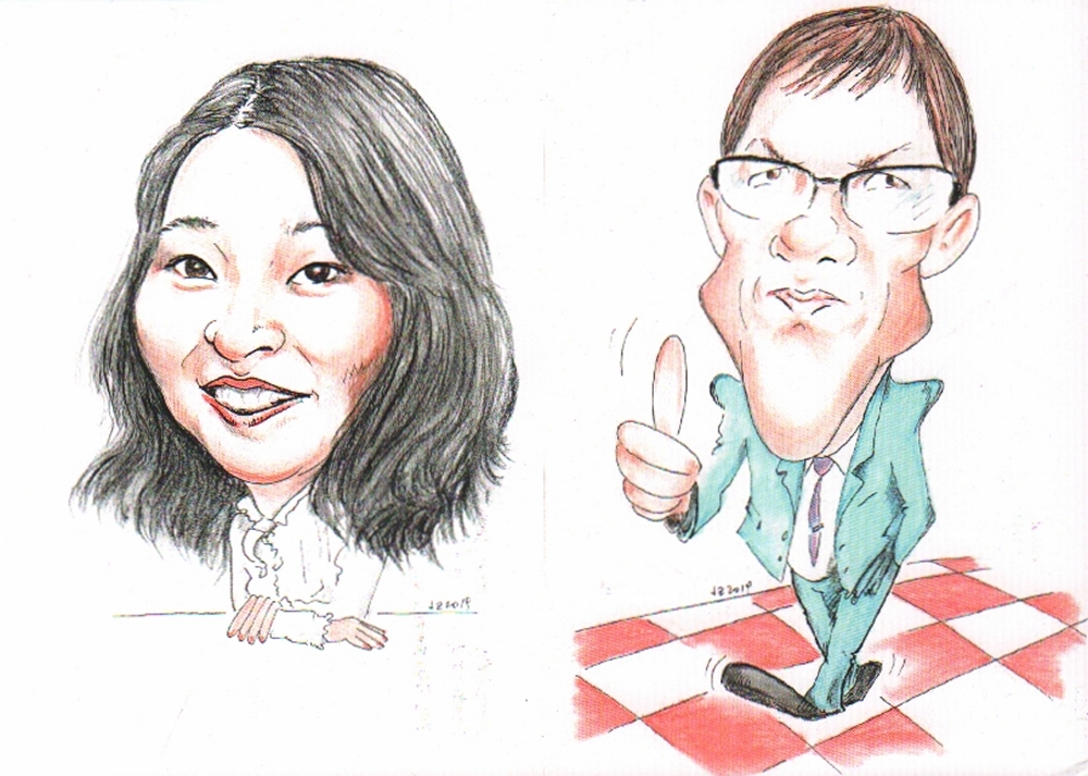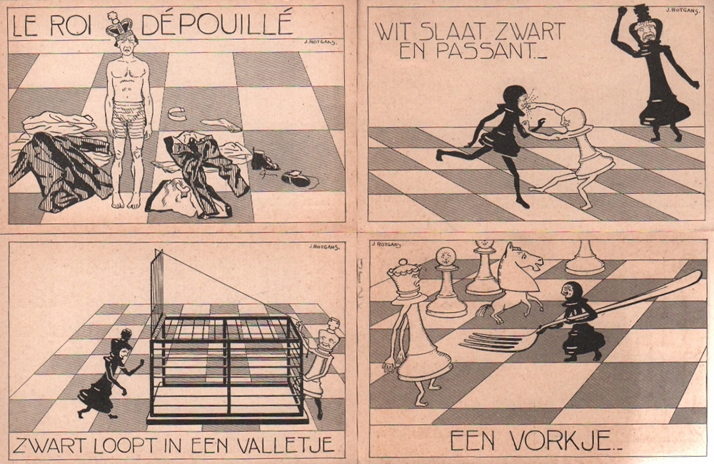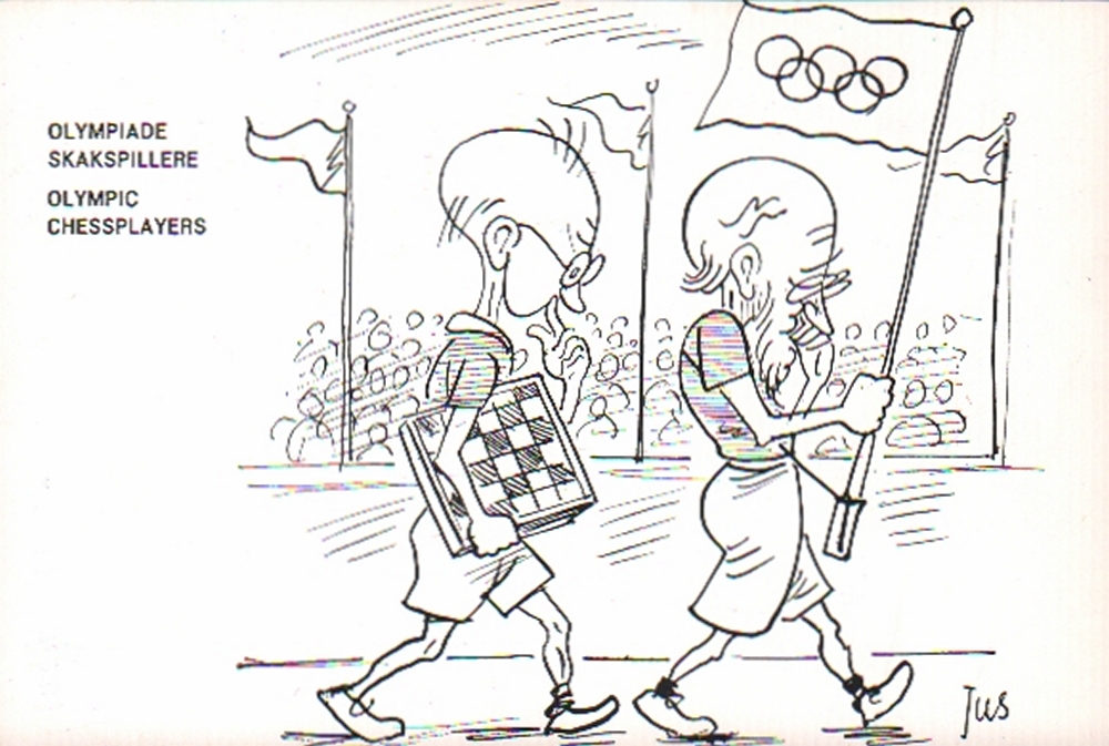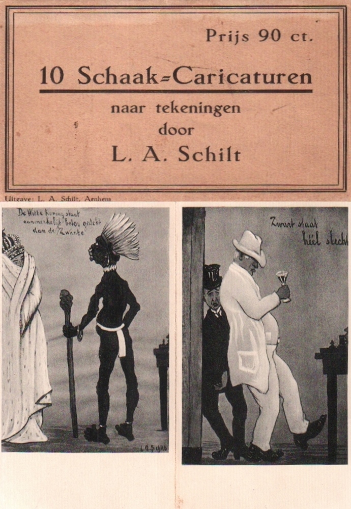 Schwarzweißes Foto von einer Porträtkarikatur des niederländischen Großmeisters