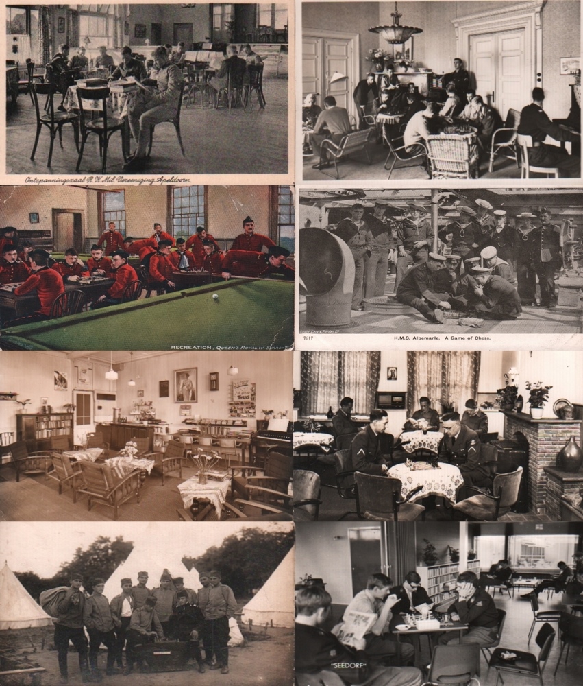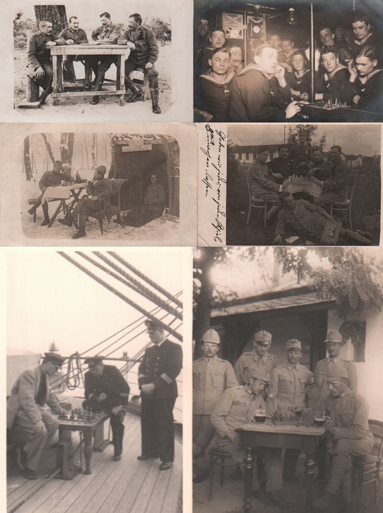 #470 Postkarte. Soldaten und Matrosen beim Schachspiel. 12 schwarzweiße und teilweise postalisch gelaufene Postkarten aus den 1910er und 1920er Jahren. Größe jeweils ca. 14 x 9 cm. (40)
