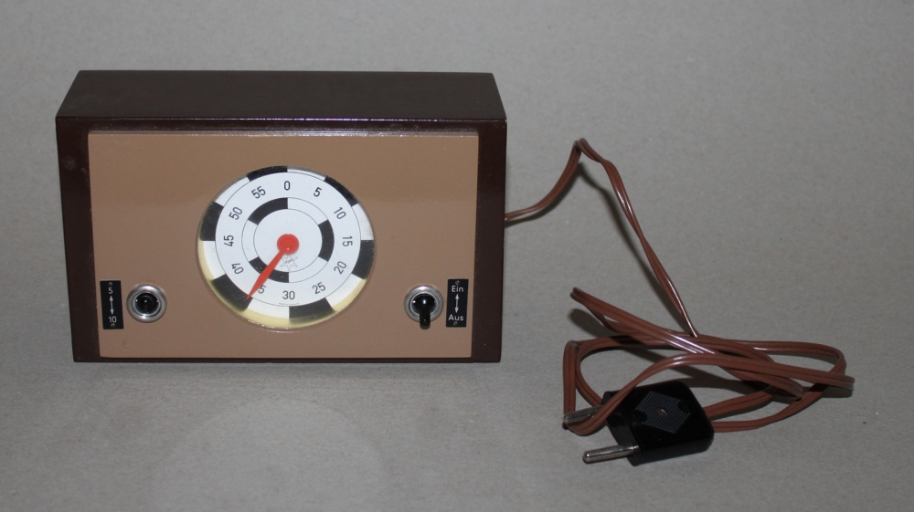#483 Schachuhr - Blitzschach. Runde elektrische Schachuhr für Blitzschach (No. 520) im viereckigen dunkelbraunen Kunststoffgehäuse mit 2 Schaltern und Steckerkabel der Firma Âlpha (Max Andres), Schwenningen aus den 1960er Jahren. Durchmesser der Uhr 7,0 cm. Größe 17,5 x 7,5 x 10,5 cm. In alter Pappschachtel Papieretikett mit Firmenlogo. (16)