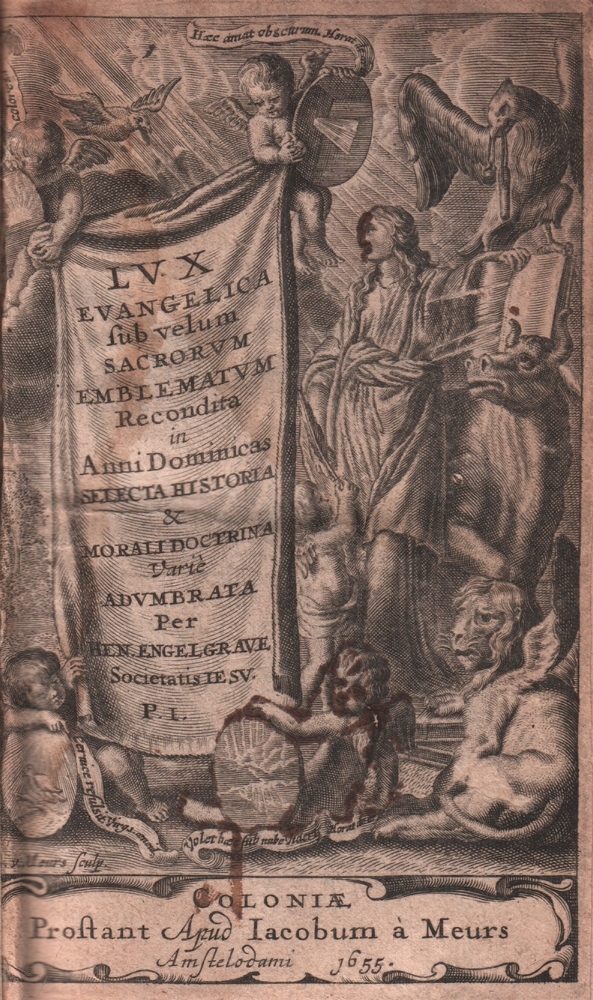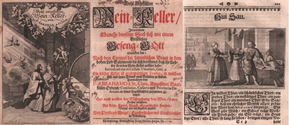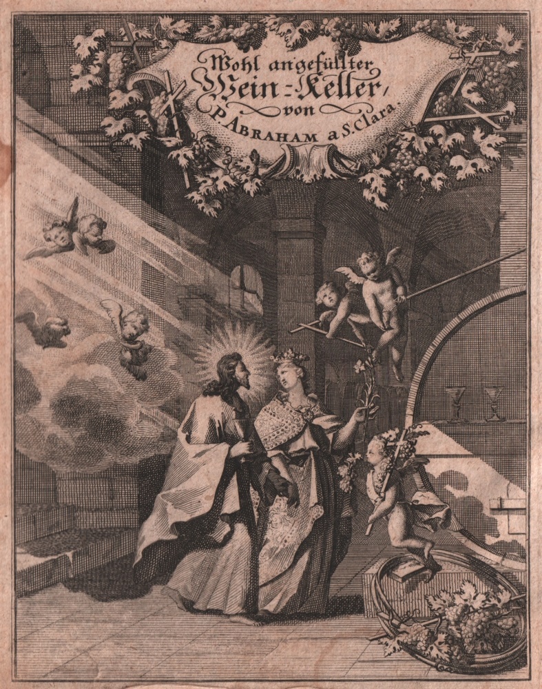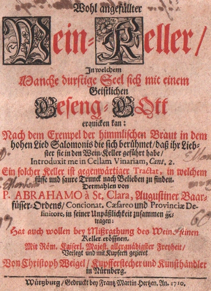 576 Abraham à Sancta Clara. Wohl angefüllter Wein – Keller / In welchem Manche durstige Seel sich mit einem Geistlichen Geseng - Gott erquicken kan: Nach dem Exempel der himmlischen Braut in dem hohen Lied Salomonis die sich berühmet / daß ihr Liebster sie in den Wein - Keller geführt habe ... / Dermahlen von P. Abraham à St. Clara, Augustiner Baarfüsser - Ordens ... in seiner Unpäßlichkeit zusammen getragen … Würzburg, Hertz für Christoph Weigel in Nürnberg, 1710. 8°. Mit 1 gestochenen Frontispiz und 50 Textkupfern. 7 Bll. (inkl Titel), 521 Seiten, 11 Bll. Register. Pergamentband mit Bezug aus altem Antiphonarblatt. (79)