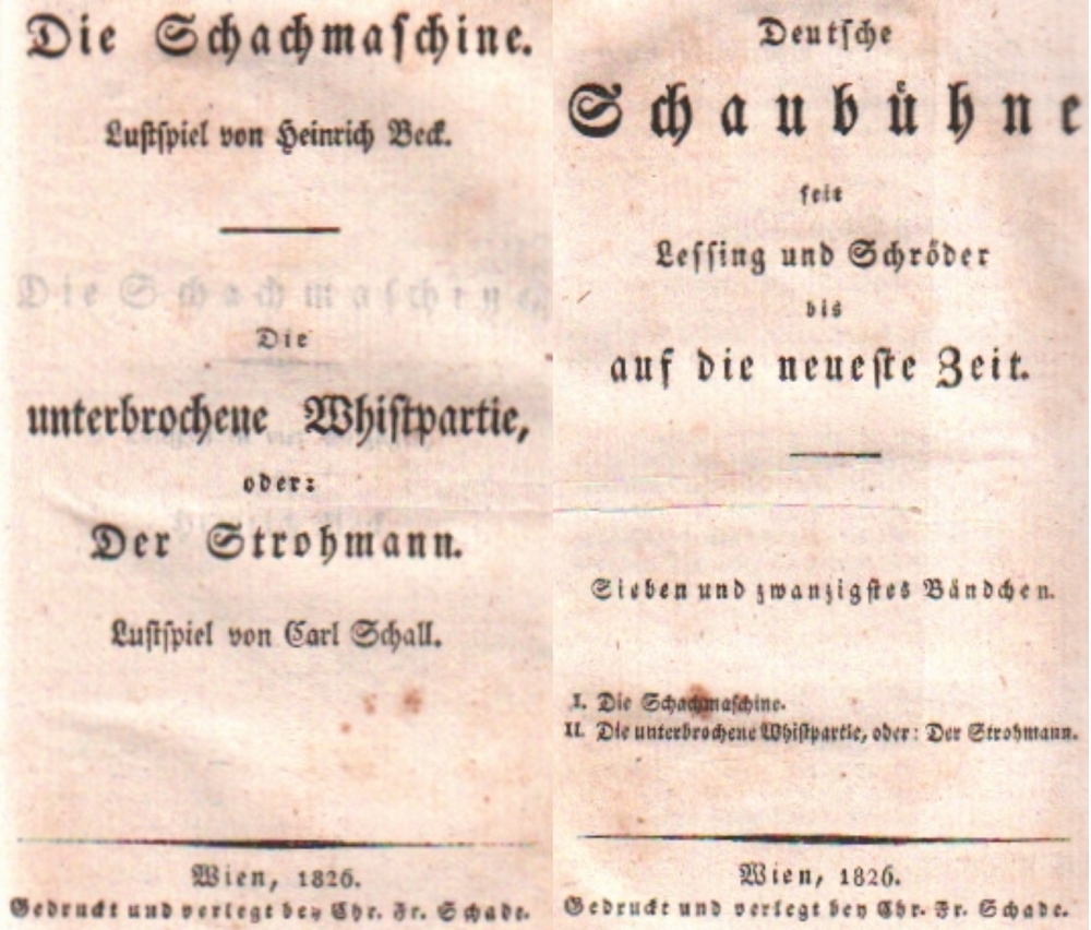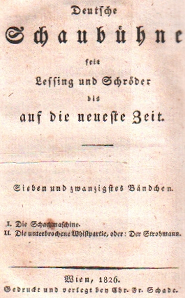 582 Beck, Heinrich. Die Schachmaschine. Lustspiel. / Schall, C. Die unterbrochene Whistpartie oder: Der Strohmann. Lustspiel. 2 Teile in diesem Sammelband: Deutsche Schaubühne seit Lessing und Schröder bis auf die neueste Zeit. 25. – 27. Bändchen. Wien, Schade, 1826. 12°. 191, 159, 186 Seiten. Brauner Halbleinenband mit Rückenschildchen. (79)