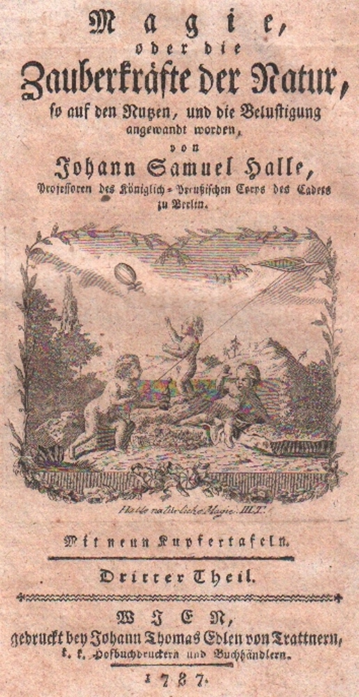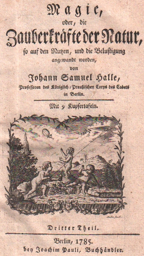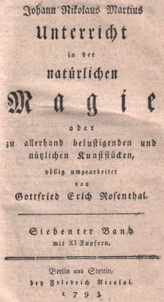 622 Wiegleb, Johann Christian. Johann Nikolaus Martius Unterricht in der natürlichen Magie, oder zu allerhand belustigenden und nützlichen Kunststücken völlig umgearbeitet von Gottfried Ehrich Rosenthal. [erstlich zusammengetragen von Johann Christian Wiegleb] 7. Band. Berlin und Stettin, Nicolai, 1793. 8°. Mit 11 gefalteten Kupfertafeln. 7 Bll., 380 Seiten, 5 Bll. Register (Vortitel fehlt). Brauner Halblederband mit Rückebnvergoldung und verblasstem Rückenschildchen. (79)