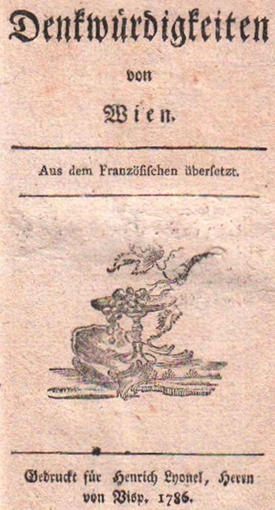 620 (Wekhrlin, Wilhelm Ludwig.) Denkwürdigkeiten von Wien. Aus dem Französischen übersetzt. 3 Partien in einem Band. [3. Auflage] Gedruckt für Henrich Lyonel, Herrn von Visp, [Nördlingen, Beck], 1786. 8°. Mit 1 gefalteten Tabelle und wenigen Holzschnittvignetten im Text. Zusammen 6 Bll. (Titel und Inhaltsverzeichnisse zu den 3 Partien), 217 Seiten. Brauner Halblederband mit Rückenschildchen. (79)