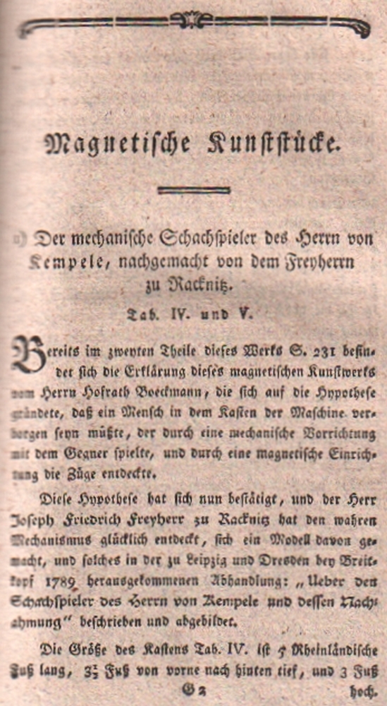 Schachspieler des Herrn von Kempelen, hypothetisch erklärt von Herrn Hofrath