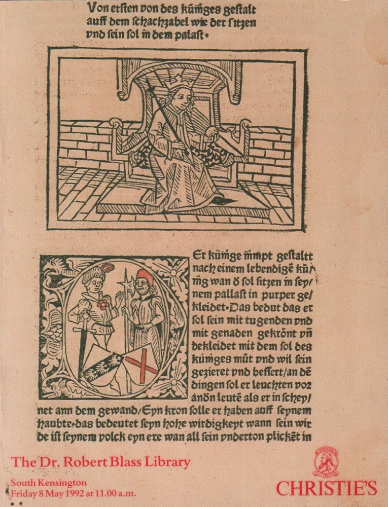 748 Blass. Auktionskatalog Christie's. The Dr. Robert Blass Library. South Kensington 8 May 1992. 4°. Mit vielen Textabbildungen, davon 4 farbig. 62 S., 2 Bll. Orig. geheftet mit farbig illustr. Umschlag. (79)
