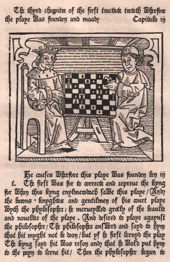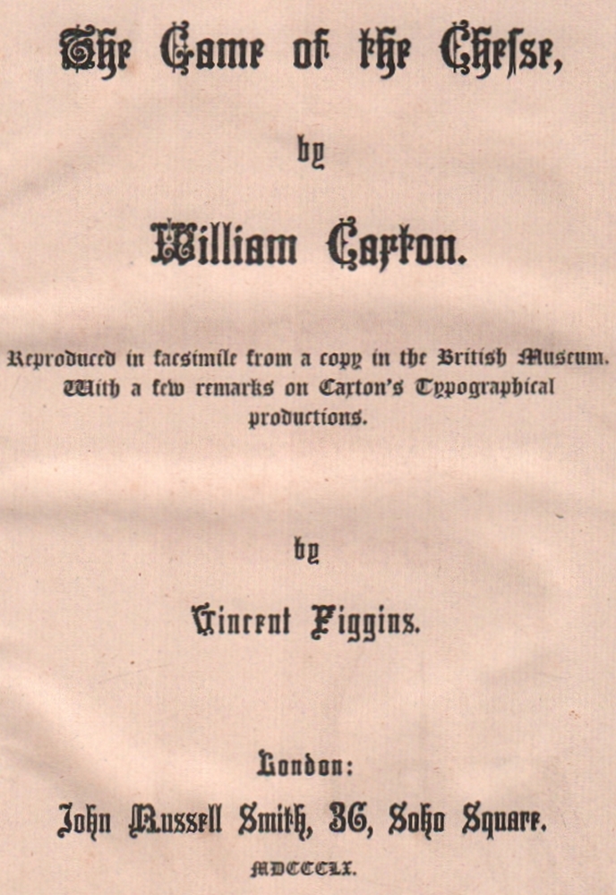 749 (Cessolis, Jacobus de.) / Caxton, William. The Game of the Chesse by ... Reproduced in facsimile from a copy in the British Museum. With a few remarks on Caxton's typographical productions by Vincent Figgins. London, Smith, 1860. 4°. Mit 24 nahezu halbseitigen Textabbildungen nach Holzschnitten, teilweise wiederholt. Titel, 84 unnummerierte Blätter (inkl. Kurztitel in Rot), 1 Bl. weiß, 13 Textseiten (remarks & list of works ascribed to Caxton), 1 Bl. Synopsis. Brauner blindgeprägter Lederband mit goldgeprägtem Rückentitel. (79)