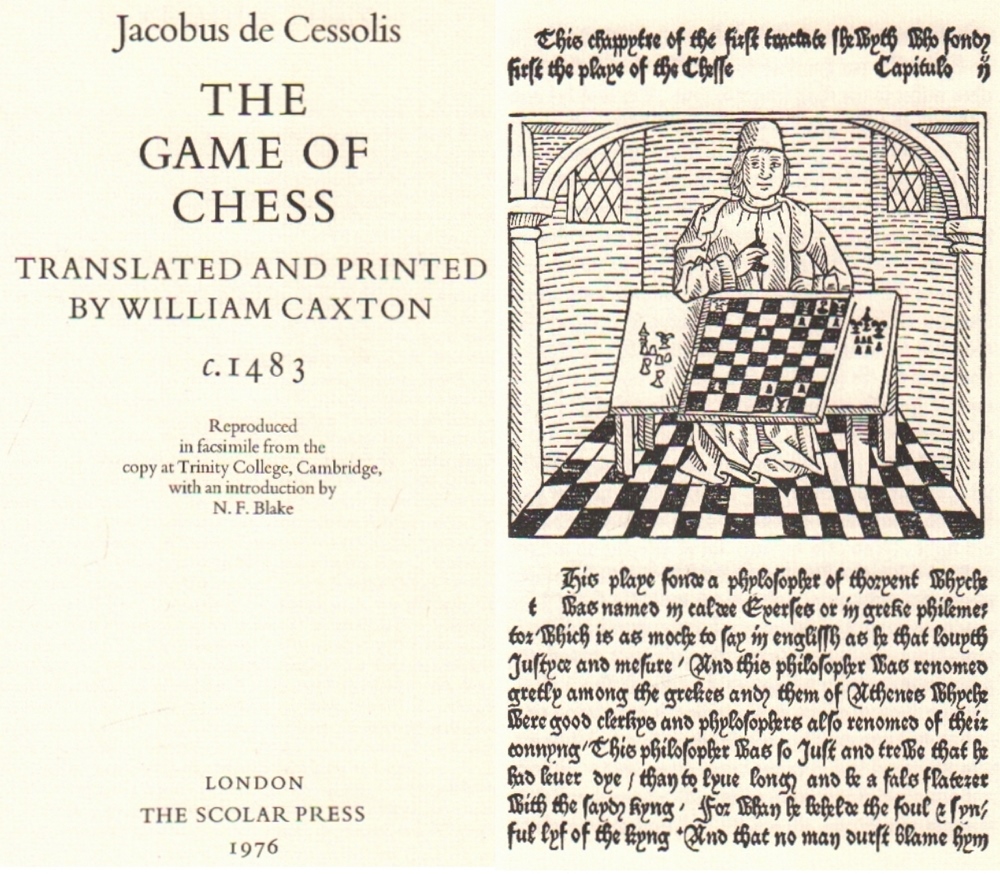 750 Cessolis, Jacobus de. The Game of Chess. Translated and printed by William Caxton c.1483. Reproduced in facsimile from the copy at Trinity College, Cambridge … London, The Scolar Press, 1976. 4°. Mit 24 nahezu halbseitigen Textabb. nach Holzschnitten, teilweise wiederholt. Titel, 3 Bll. Einleitung, 1 Bl. weiß, 83 unnum. Blätter, 1 Bl. weiß. Orig. grauer Leinenband mit Rückenschildchen. (79)