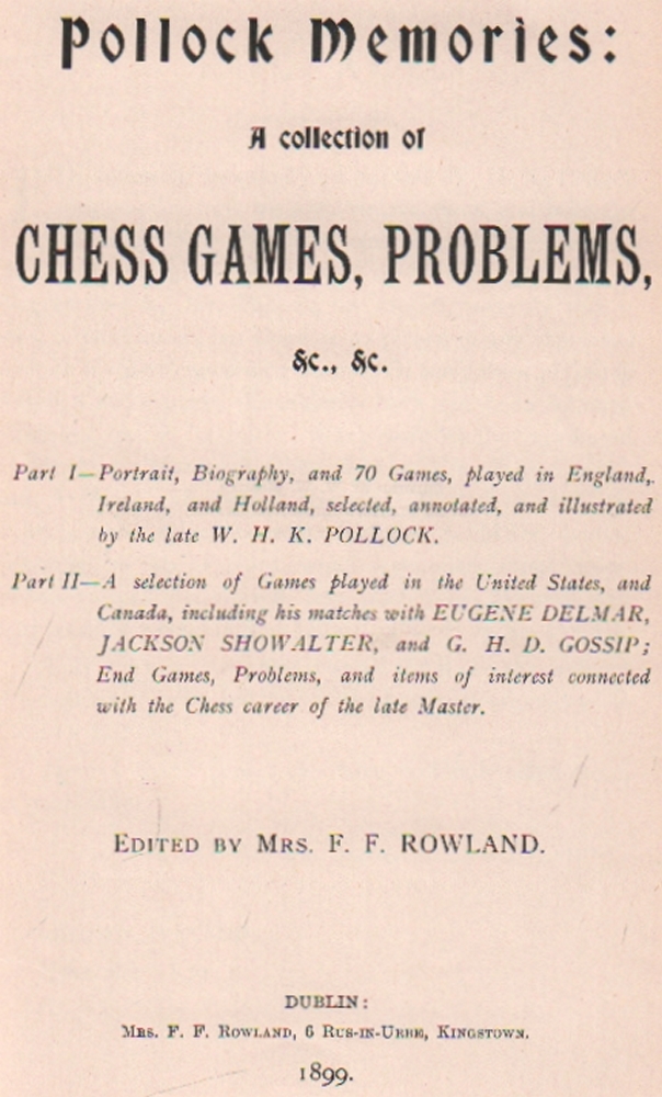 768 Pollock. Rowland, F. F. (Hrsg.) Pollock Memories: A collection of chess games, problems, etc. Part I - Portrait, Biography, and 70 games ... annotated ... by the late W. H. K. Pollock. Part II - A selection of games played in the United States, and Canada ... End Games, Problems ... Dublin, Rowland, 1899. 8°. Mit 1 Porträttafel und vielen Diagrammen. 1 Bl.., 159, III S. Index (1 Bl. Anzeigen fehlt). Orig. blauer Leinenband. (19)