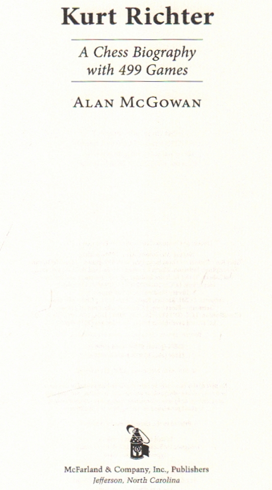 769 Richter. McGowan, Alan. Kurt Richter. A Chess Biography with 499 Games. Jefferson (NC), McFarland, ca. 2018. 4°. Mit Textabb. und Diagr. XII, 368 Seiten. Orig. Leinenband mit Drucktitel auf Vorderdeckel und Rücken. (Einband an den Ecken bestoßen) (79) € 30,00