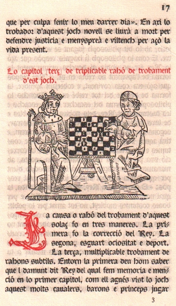 788 Cessolis, Jacobus de. De les costumes dels homens e dels oficis dels nobles, sobrel Joch dels Escachs. Compost per Frare Jacme Cessulis. Translatat de latí. Estampada per primera volta la versió catalana treta d'un ms. del quinzèn segle, per cura de Joseph Brunet. Barcelona, L'Avenç, (1900). 4°. Mit 20 Textabbildungen und einigen farbigen Initialen. 159 Seiten, 2 Bll. Aufgeschnittene Broschur. (79)