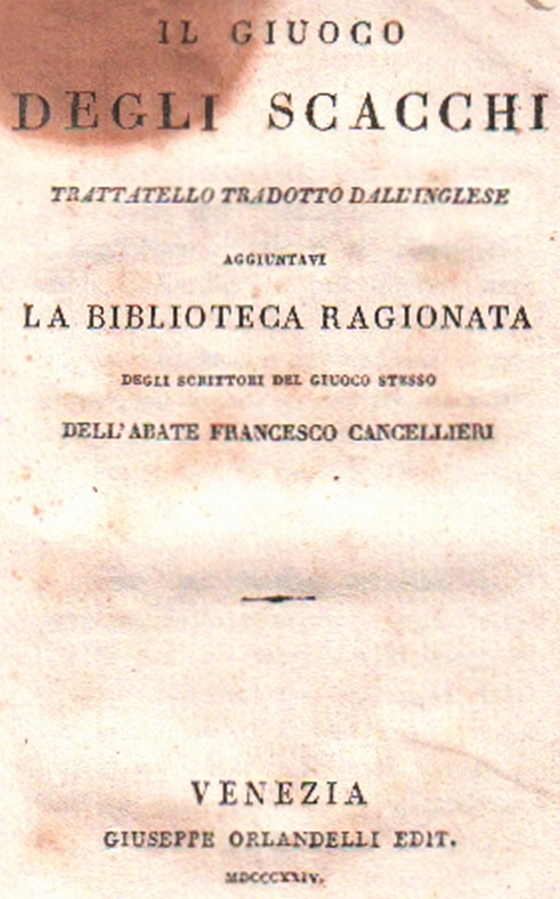 789 (Colombo, Michele = Übersetzer) Il Giuoco degli Scacchi. Trattatello tradotto dall'Inglese aggiuntavi la Biblioteca Ragionata degli scittori del giuoco stesso dell'Abate Francesco Cancellieri. Venedig, Orlandelli, 1824. 8°. Mit Kupferstichfrontispiz. (Schachbrett mit 6 Spielfiguren). 174 Seiten. Aufgeschnittene Broschur im lithograpghierten Umschlag. (49)