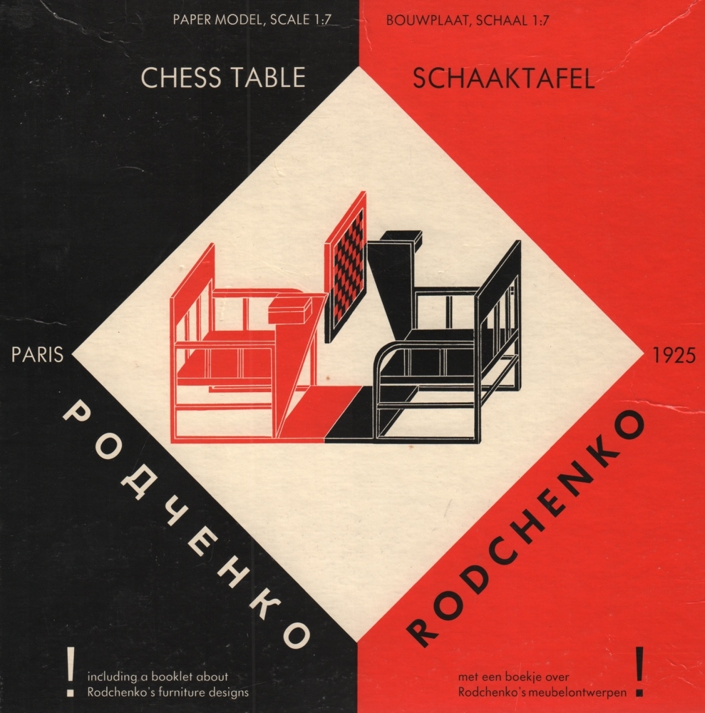 799 Rodchenko, A. M. Schaaktafel. Bouwplaat, schaal 1 : 7 ... / Chess table. Paper model, scale 1 : 7. Including a booklet about Rodchenko's furniture designs. Amsterdam, Thoth, ca. 1989. 1 Bl. Montageanleitung, 7 Tafeln und 1 geheftete Broschüre mit 12 Seiten. In farbig illustrierter Pappschachtel (Größe 22 x 22 cm). (19)