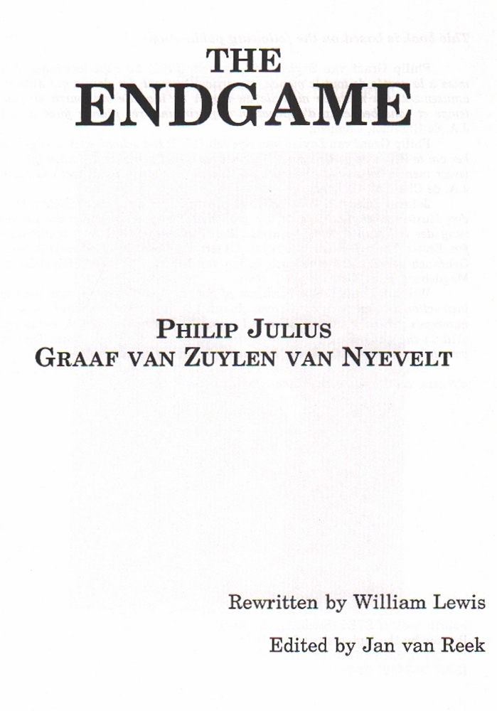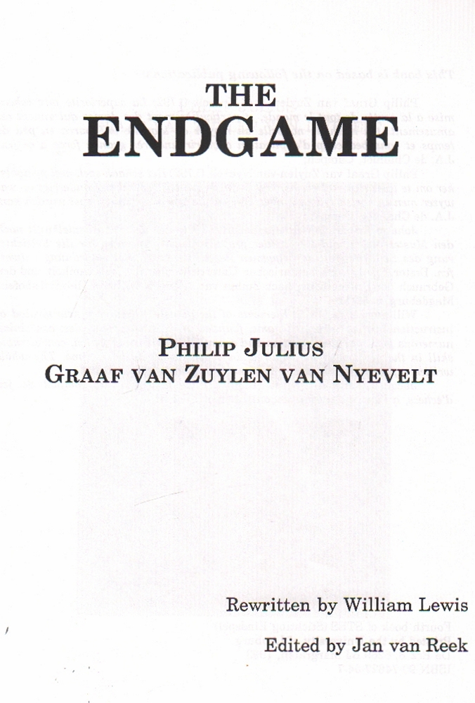 803 Zuylen van Nyevelt. Reek, Jan van. (Hrsg.) The Endgame. Philip Julius Graaf van Zuylen van Nyevelt. Rewritten by William Lewis. Margraten ca. 1993. 4°. Mit wenigen Textabb. und vielen Diagrammen. 64 Seiten. Original geheftet. (19)