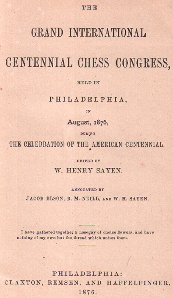1017 Philadelphia 1876. Sayen, W. Henry. (Edited) The Grand International Centennial Chess Congress, held in Philadelphia in August, 1876. During the celebration of the American centennial. Annotated by Jacob Elson, B. M. Neill, and W. H. Sayen. Philadelphia, Claxton etc., 1876. 8°. XIX, S. 25 - 199. Originaler brauner Leinenband mit goldgeprägtem Rückentitel. (LS)